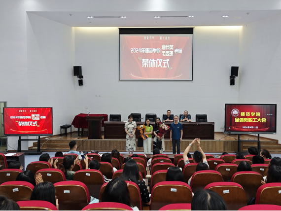 最后,学院为本学期即将退休的唐月英和毛西琼老师举行了荣休仪式。师范学院全体人员将接好她们递过来的“交接棒”,传承学院一以贯之的光荣传统,彰显新时代的崭新风貌,在新征程上续写师范学院的华丽篇章。