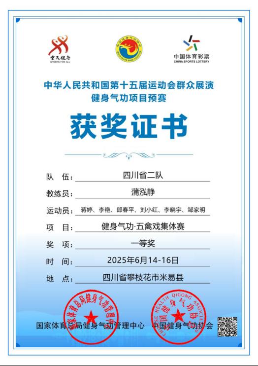 与此同时,专业教师在高水平赛事指导中再添亮眼成绩。2025 6 月,我校社会体育专业教师蒲泓静受四川省社会体育指导中心聘请,以教练员身份指导四川省二队,参与中华人民共和国第十五届运动会群众展演健身气功项目预赛。在其专业指导下,四川省二队在健身气功・五禽戏集体赛中表现出色,斩获一等奖,成功入围决赛,充分展现了我校教师在体育专项指导领域的过硬专业素养。