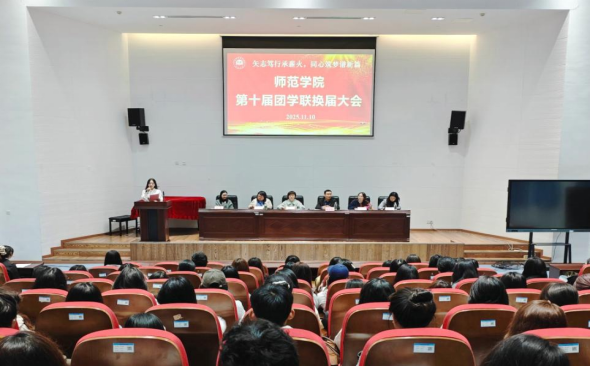 2025年11月10日下午,广安职业技术学院师范学院第十届团学联换届大会在岳秀楼翔凤厅隆重举行。师范学院党总支书记彭松林、副书记姚光红,团学联各指导老师出席本次大会,第九届、第十届团学联学生干部及干事代表共同参会。