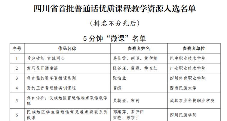 近日,四川省教师发展中心发文公布首批普通话优质课程教学资源遴选结果。广安职业技术学院师范学院普通话教师团队打造的两类微课双双入选,获评省级优质教学资源,将免费面向民族地区、革命老区重点人群开放自主选学。