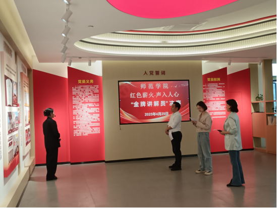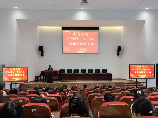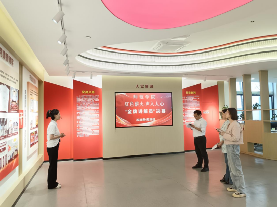 为丰富校园文化内涵,鼓励学生以生动方式传播党史知识,传承红色基因,传播学院特色文化,师范学院于2025年4月29日开展了以“红色薪火·声入人心”为主题的“金牌讲解员”比赛决赛。