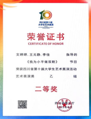 四川省大学生艺术展演活动,一等奖2项,二等奖3项。